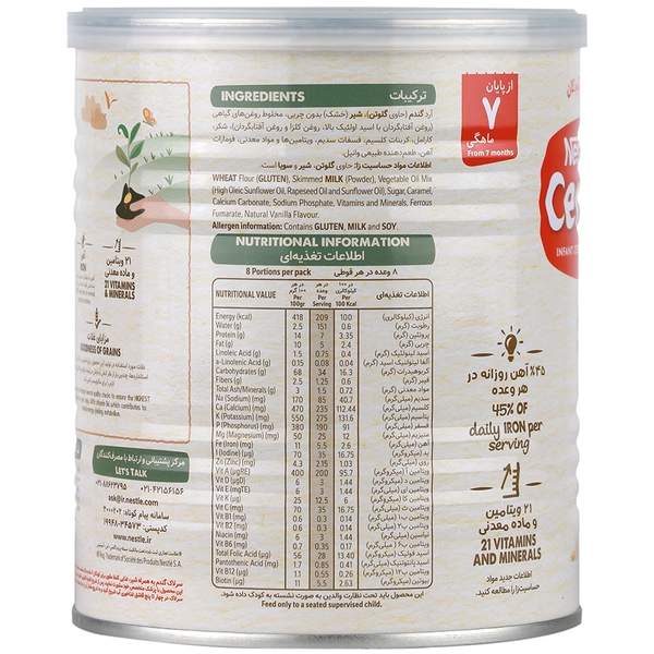 هر وعده سرلاک گندم به همراه شیر نستله بیش از نیمی از نیاز روزانه به آهن کودک تأمین میکند. کودک شما 5 برابر بیشتر از یک فرد بالغ به آهن نیاز دارد. آهن برای تکامل قوای شناختی کودک ضروری است. ویتامین C میزان جذب آهن در بدن را افزایش میدهد.