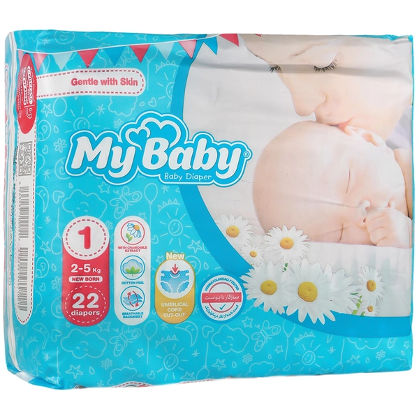 پوشک چسبی مای بیبی سایز 1 برای نوزادانی با محدوده وزنی 2 تا 5 کیلوگرم در بسته بندی های 22 و 40 عددی تولید می شود. در ساختار این پوشک از عصاره بابونه جهت محافظت پوست ظریف و حساس نوزادان در برابر حساسیت استفاده شده است. همچنین لایه رویی و بیرونی پوشک چسبی بچه مای بیبی سایز 1 به گونه ای طراحی شده که هیچگونه حساسیتی برای پوست نوزادان به همراه نداشته باشد. لایه رویی به نرمی پنبه بوده و لایه بیرونی نیز از قابلیت عبور هوا برخوردار است. لایه جذب و انتشار به همراه لایه محافظ کشسان عمودی به ترتیب به منظور توزیع یکنواخت مایع در سطح پوشک و جلوگیری از نشتی کناره ها، در این پوشک تعبیه شده اند. نوارهای کناری کشسان در پوشک چسبی مای بی بی سایز ? جهت انعطاف پذیری بیشتر پوشک دور کمر نوزاد وجود دارند. به علاوه کش های راحت دور ران نیز از نشتی مایع جلوگیری می کنند. چسب های مطمئن، محکم و قابل تنظیم به کار رفته در پوشک مای بیبی سایز ، موجب کاربرد آسان آن روی بدن نوزاد می شوند. همچنین در این پوشک انحنای بند ناف برای جلوگیری از تماس بند ناف نوزاد با پوشک در نظر گرفته شده است.