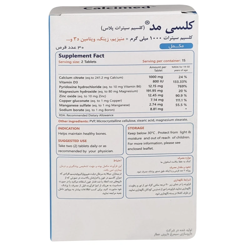 | کلسیم سیترات ( معادل۲۴۱.۲ میلى گرم کلسیم) | ۱۰۰۰ میلی گرم |